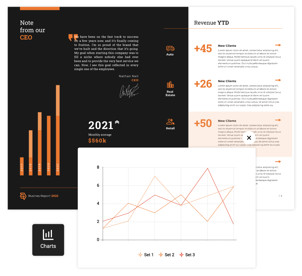 Donnez à vos rapports commerciaux un aspect élégant en utilisant le format digital HTML5. Grâce à notre logiciel sur le Cloud, vous pouvez créer des rapports attractifs en convertissant des PDFs déjà prêts ou en créant de nouveaux à partir de zéro, ou avec l’un de nos modèles. Commencer gratuitement.